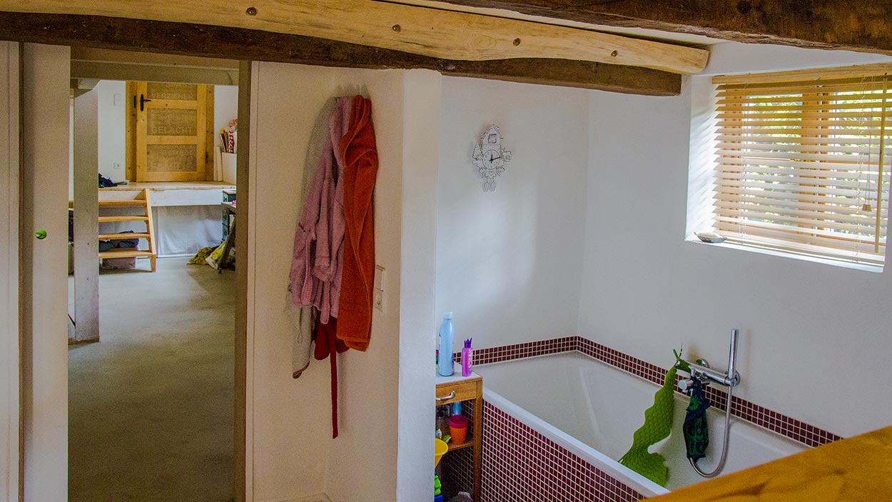 Steffi: Eigentlich war unser Badezimmer der Anlass für den Umbau, denn in unserer Wohnung gab es nur ein sehr kleines Badezimmer von etwa 5 Quadratmetern mit einer winzigen Dusche. Als die Kinder zur Welt kamen, hatten wir den Wunsch nach einem größeren Bad mit Wanne, doch lange Zeit war nicht klar, wo dieses Badezimmer entstehen könnte. Wir hatten damals eigentlich geplant, eines Tages mal das Dach der Tenne auszubauen. Doch allein ein neues Dach hätte mindestens 30.000 Euro gekostet plus die Kosten für den Ausbau.