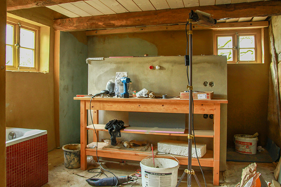 "Im alten Holzraum musste ich den Boden in einer Tiefe von etwa 40 Zentimetern ausschachten. Nur so konnte der Aufbau des neuen Fußbodens mit Bodenplatte, Dämmung, Fußbodenheizung und Estrich Platz finden. Diese Bodenarbeiten waren extrem anstrengend vor allen Dingen, weil man alles mit Schaufel und Schubkarre erledigen musste. Immer mal wieder für eine Stunde gearbeitet, dann wieder etwas anderes gemacht, ausgeruht und nach einer Woche war es geschafft."