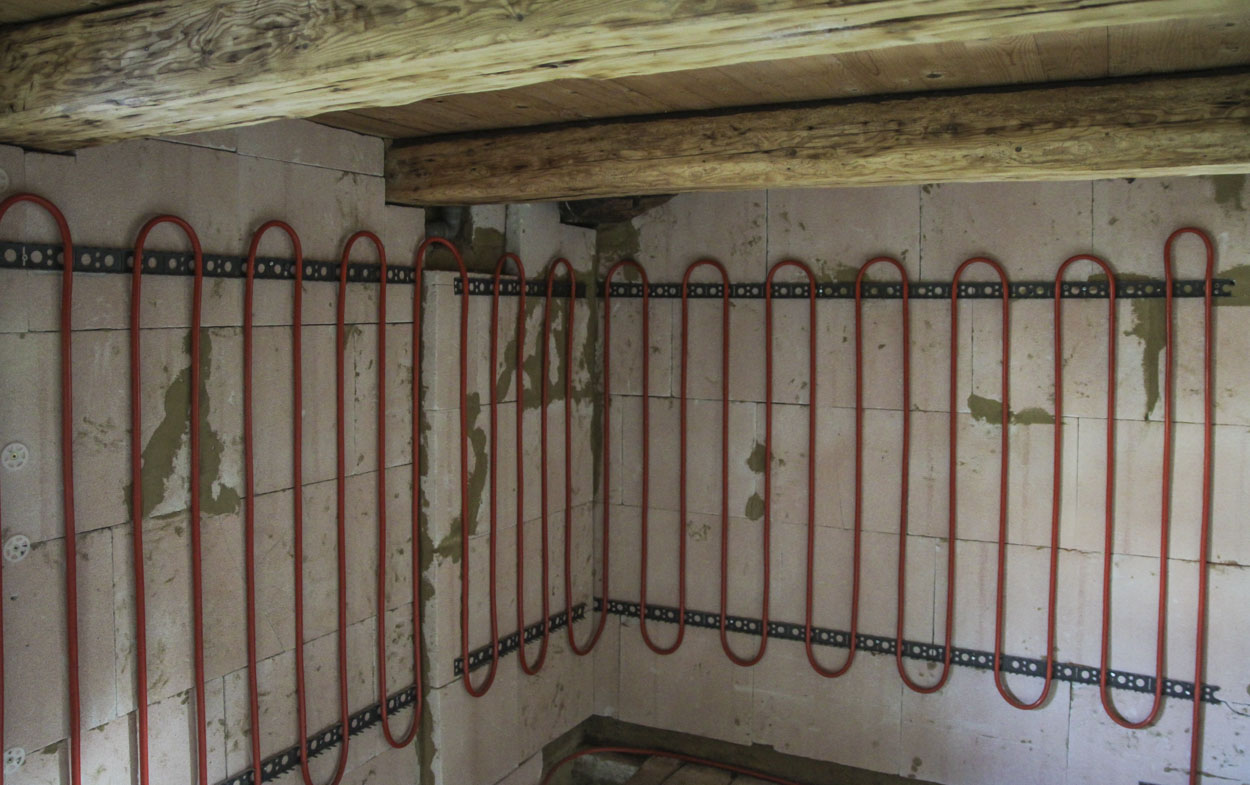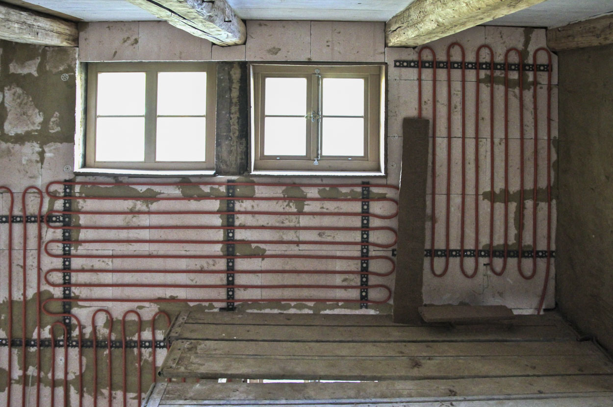Alex: Da wir von außen unbedingt das Fachwerk erhalten wollten, kam eine Dämmung von außen nicht in Frage. Wir mussten also die Dämmung irgendwie innen anbringen. Beim Entkernen hatte ich entdeckt, dass in den inneren Gefachen noch die alten Lehmziegeln verbaut waren und das Ganze mit Lehm verputzt war. Beim Besuch Umbau-Messe hatte ich dann Herrn Schade kennen gelernt, den Chef der Firma SMB, die sich schon vor über 25 Jahren auf das Arbeiten mit Lehm spezialisiert hatte. Zusammen mit ihm haben wir dann das Wärme- und Energiekonzept entwickelt. Das Herzstück sind Wandheizungsrohre, die komplett in Lehm liegen und über die erwärmte Wand eine wunderbare Strahlungswärme abgeben.