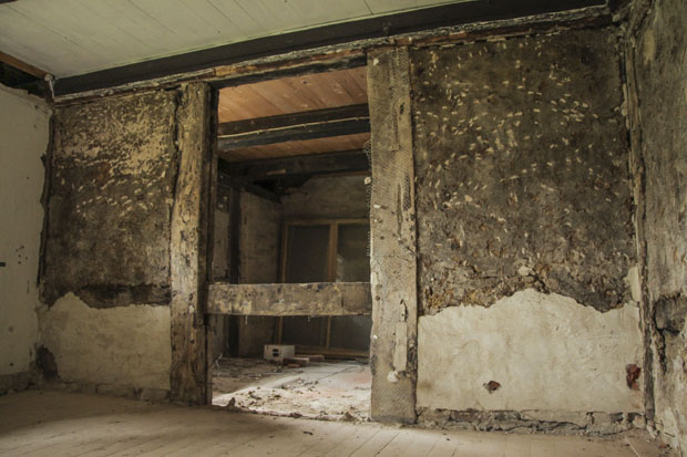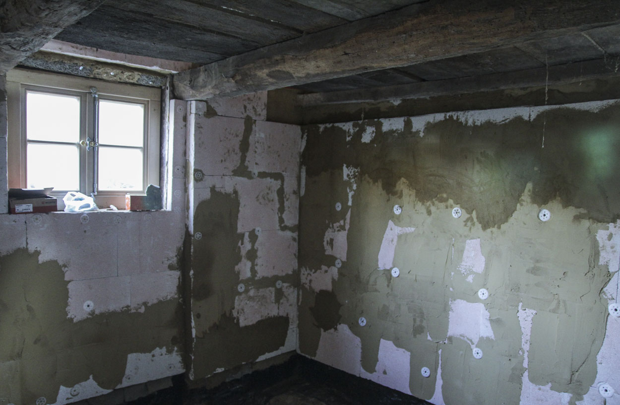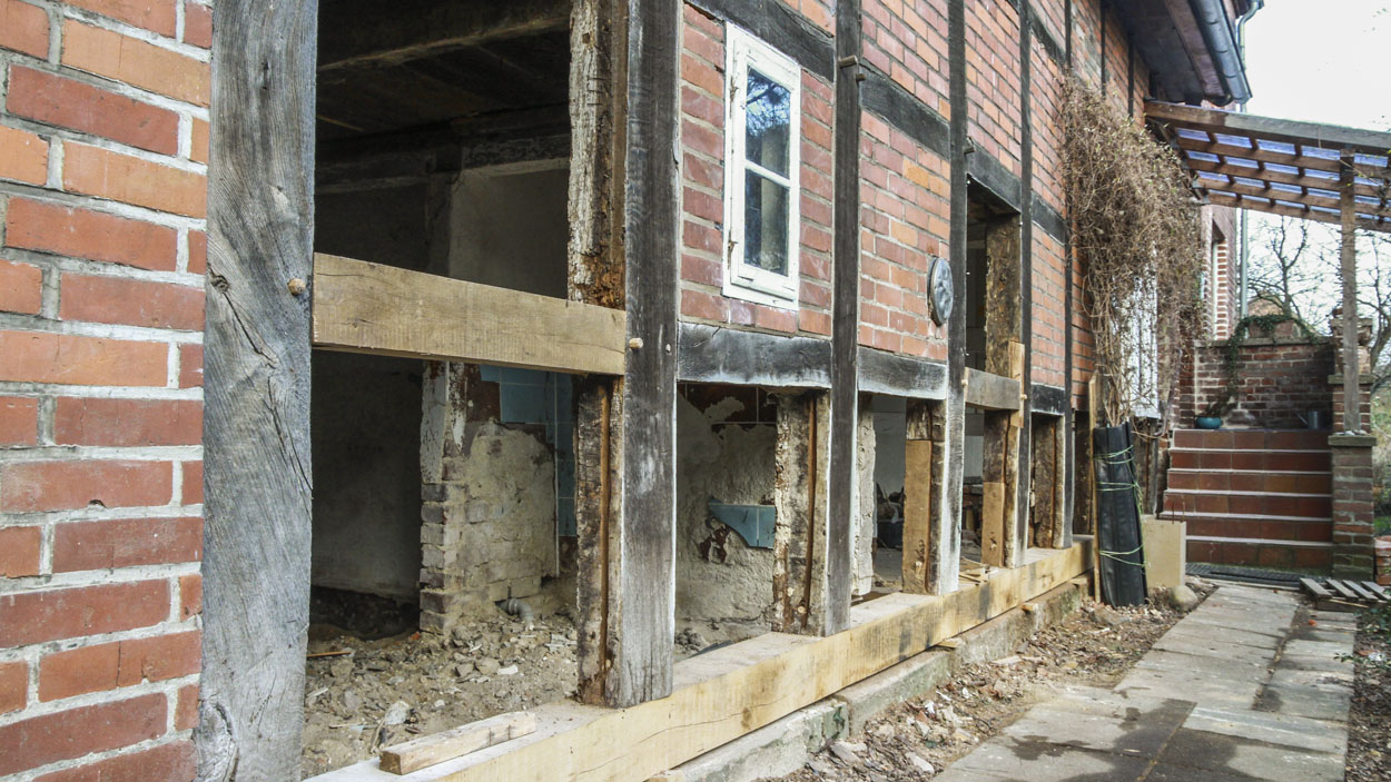 Zuerst musste der als Gästezimmer genutzte vordere Raum des Ostflügels komplett entkernt werden. Erst da wurde sichtbar, dass die Holzschwelle auf der gesamten Ostseite marode und an vielen Stellen weggefault war. Auf dieser Schwelle stehen die gesamten Ständer des Fachwerks und ein Neuaufbau macht nur Sinn, wenn die Schwelle ausgetauscht wird. Für dieses Projekt mussten die Ständer alle von außen abgestützt werden, so dass das Gewicht des Hauses dann nicht mehr auf der Schwelle ruhte. Erst dann konnten die unteren Gefache herausgenommen und die alte Schwelle herausgeschnitten werden. Diese Arbeiten wurden von der auf alte Holzbauweisen spezialisierten Firma Holzverbindung ausgeführt. Andere Arbeiten wie das Entkernen haben die beiden selber gemacht.